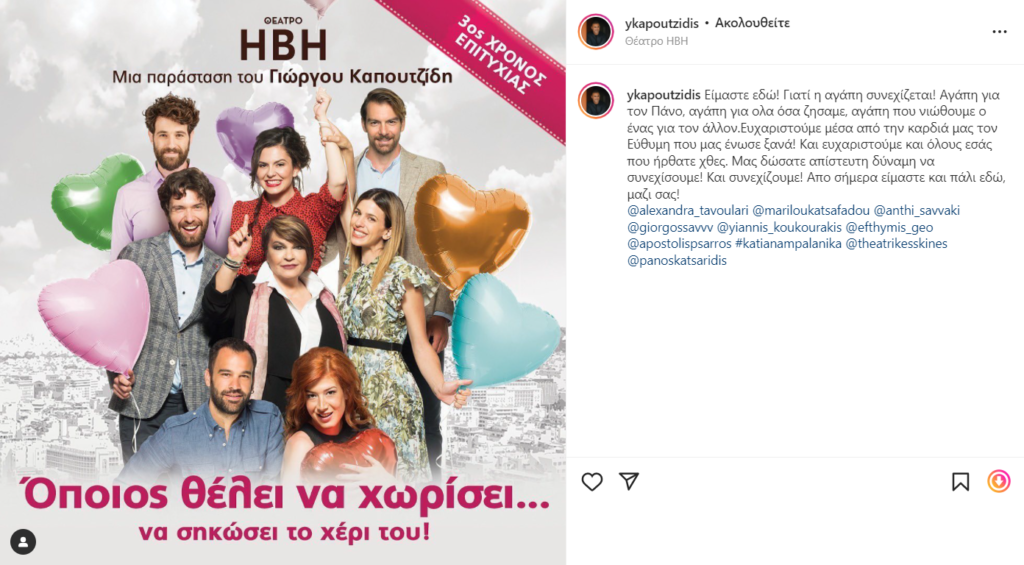 O Γιώργος Καπουτζίδης που είναι ιδιαίτερα ενεργός στα social media, έκανε μια συγκινητική ανάρτηση στον προσωπικό του λογαριασμό στο Instagram, όπου σε αυτή ανακοίνωσε την επανέναρξη της θεατρικής παράστασης, ενώ έγραψε κι ένα μήνυμα για τον Πάνο Νάτση.