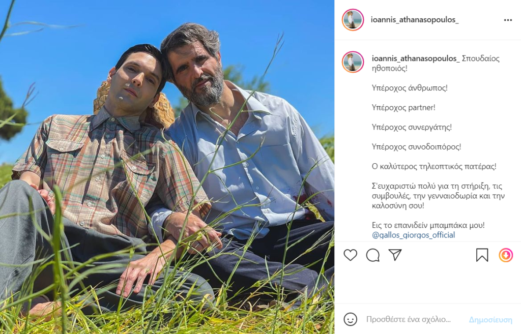 «Σπουδαίος ηθοποιός! Υπέροχος άνθρωπος! Υπέροχος partner! Υπέροχος συνεργάτης! Υπέροχος συνοδοιπόρος! Ο καλύτερος τηλεοπτικός πατέρας! Σ’ευχαριστώ πολύ για τη στήριξη, τις συμβουλές, την γενναιοδωρία και την καλοσύνη σου. Εις το επανιδείν μπαμπάκα μου!», έγραψε ο Ιωάννης Αθανασόπουλος στην λεζάντα του post του.