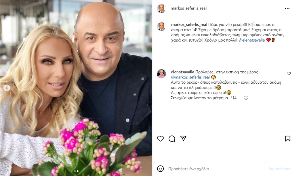 «Πάμε για νέο ρεκόρ!!! Βέβαια είμαστε ακόμα στα 14! Έχουμε δρόμο μπροστά μας! Εύχομαι αυτός ο δρόμος να είναι ευκολοδιάβατος, πλημμυρισμένος από αγάπη, χαρά και ευτυχία! Χρόνια μας πολλά» έγραψε ο Μάρκος Σεφερλής στην ανάρτησή του.