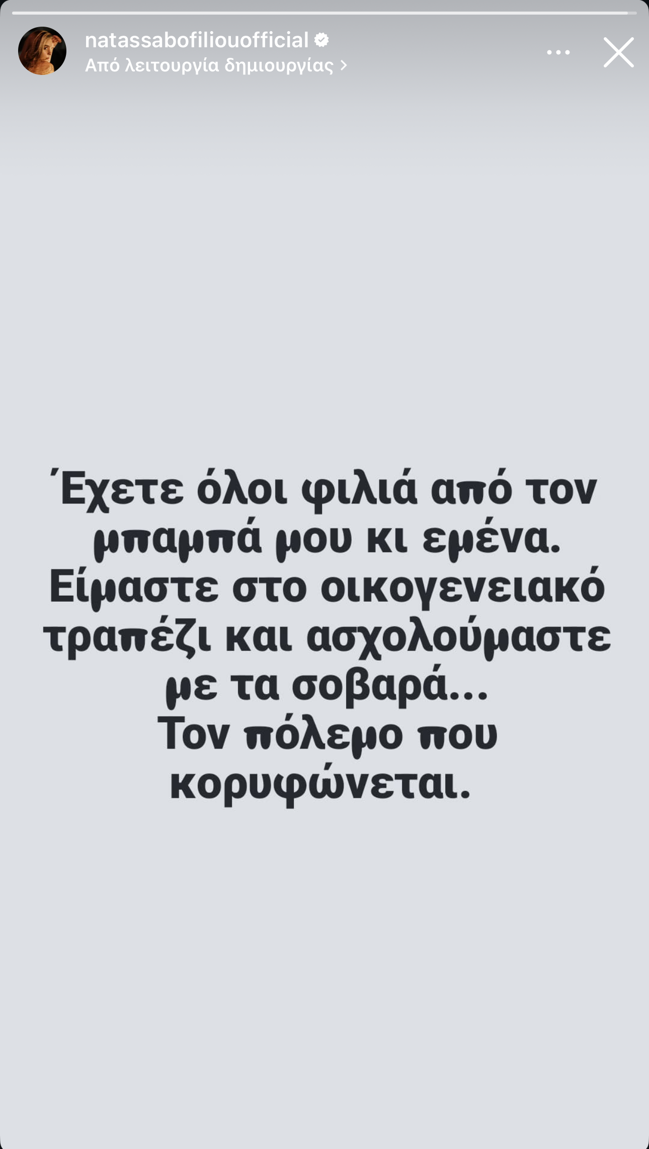 «Έχετε όλοι φιλιά από τον μπαμπά μου κι εμένα. Είμαστε στο οικογενειακό τραπέζι και ασχολούμαστε με τα σοβαρά… Τον πόλεμο που κορυφώνεται» έγραψε η Νατάσσα Μποφίλιου.