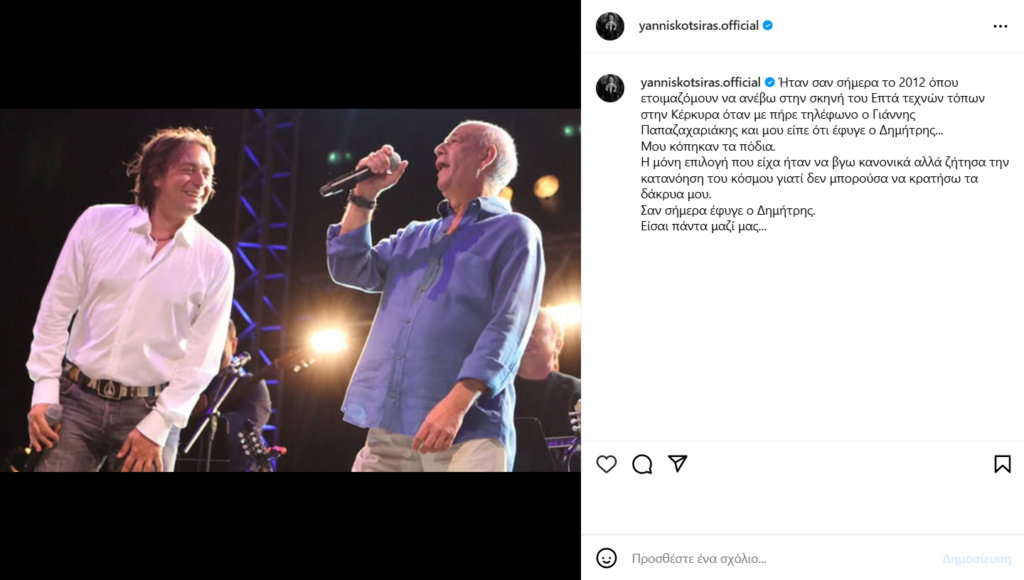«Ήταν σαν σήμερα το 2012 όπου ετοιμαζόμουν να ανέβω στην σκηνή του Επτά τεχνών τόπων στην Κέρκυρα όταν με πήρε τηλέφωνο ο Γιάννης Παπαζαχαριάκης και μου είπε ότι έφυγε ο Δημήτρης…