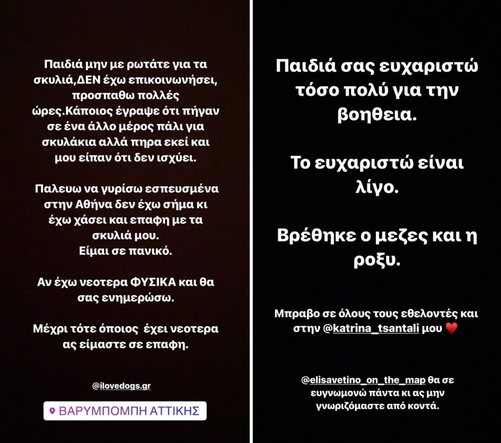 Ενώ λίγο αργότερα η Δανάη ενημέρωσε τους followers της ότι οι τετράποδοι φίλοι της βρέθηκαν χάρη στη βοήθεια των εθελοντών και της Κατρίνας Τσάνταλη.