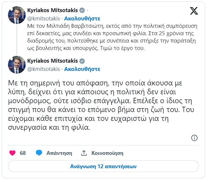 Ωστόσο, μετά την ανακοίνωση του Μιλτιάδη Βαρβιτσιώτη, ο Κυριάκος Μητσοτάκης έκανε μια ανάρτηση στον επίσημο λογαριασμό του στο X/Twitter και τον ευχαρίστησε και του ευχήθηκε κάθε επιτυχία.