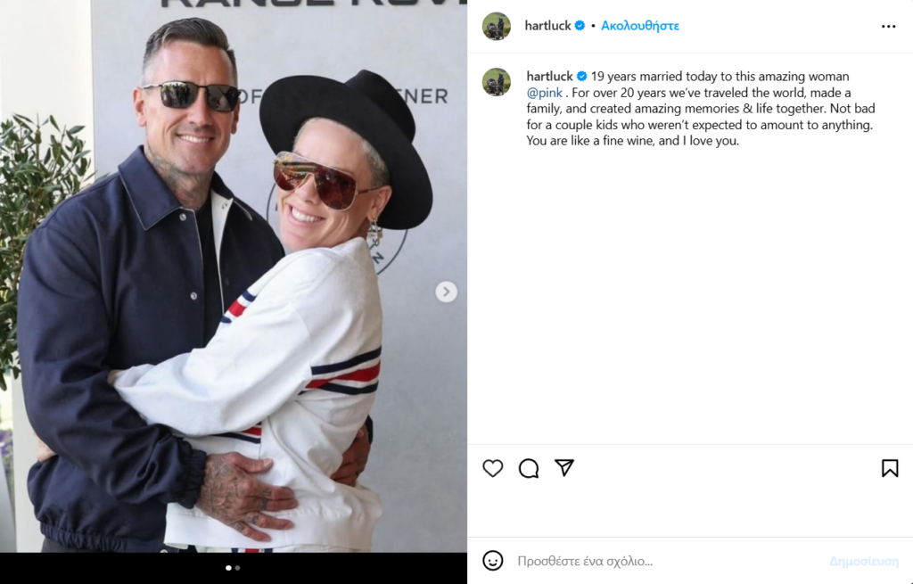 «Πριν από 19 χρόνια, σε μια παραλία στην Κόστα Ρίκα, πήραμε και οι δύο μια ευκαιρία που δεν ήμασταν σίγουροι αν πιστεύαμε καν. Είμαι τόσο χαρούμενη που το κάναμε. Είμαι μαζί σου περισσότερο καιρό από όσο δεν ήμουν. Είσαι η μοναδική μου σταθερά. Με αγάπησες, με μίσησες και με αγάπησες ξανά. Αγαπώ την ιστορία μας, όπως κι αν γραφτεί. Είναι γεμάτη δύναμη και είναι γλυκιά. Σε ευχαριστώ που ήσουν δίπλα μου όλα αυτά τα χρόνια. Σε αγαπώ για πάντα», έγραψε η Pink στην ανάρτηση της.