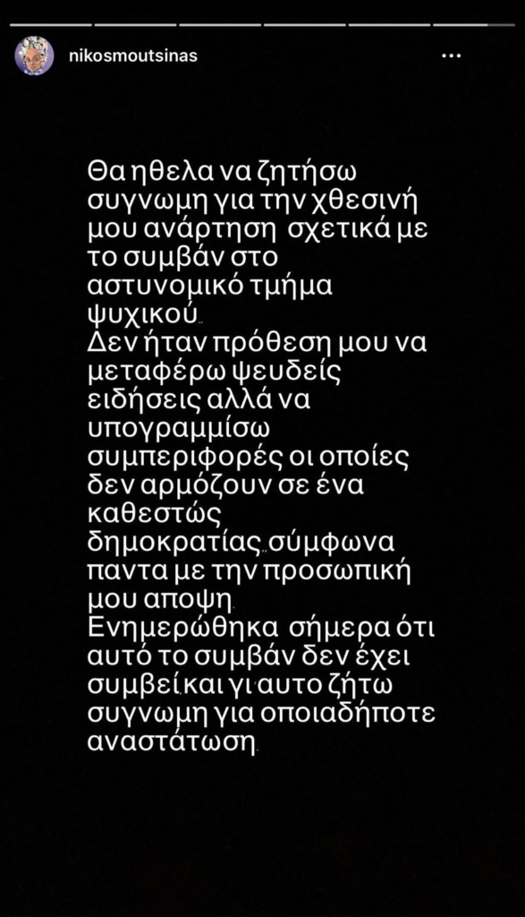 «Θα ήθελα να ζητήσω συγγνώμη για την χθεσινή μου ανάρτηση σχετικά με το συμβάν στο αστυνομικό τμήμα Ψυχικού. Δεν ήταν πρόθεσή μου να μεταφέρω ψευδείς ειδήσεις αλλά να υπογραμμίσω συμπεριφορές οι οποίες δεν αρμόζουν σε ένα καθεστώς δημοκρατίας, σύμφωνα πάντα με την προσωπική μου άποψη. Ενημερώθηκα σήμερα ότι αυτό το συμβάν δεν έχει συμβεί γι αυτό ζητώ συγγνώμη για οποιαδήποτε αναστάτωση», έγραψε ο Νίκος Μουτσινάς.