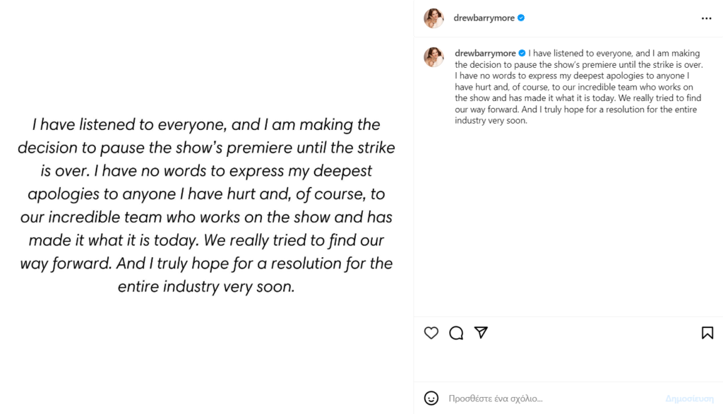 Μάλιστα, η Drew Barrymore στην ανάρτηση της ανέφερε πως αποφάσισε τελικά να αναβάλλει την πρεμιέρα του tok show της.