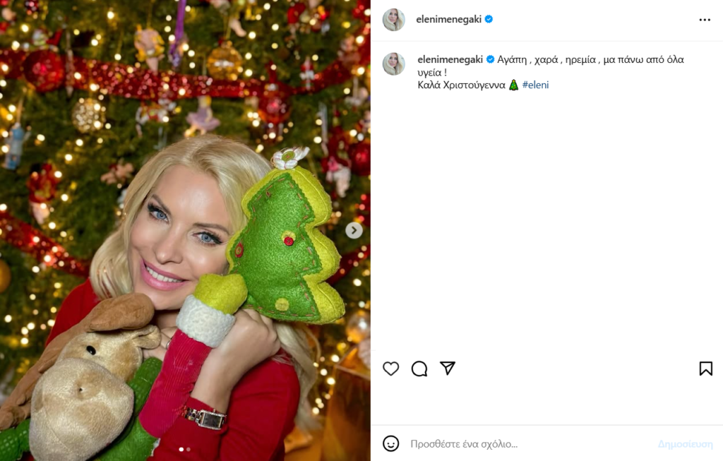«Αγάπη, χαρά, ηρεμία, μα πάνω από όλα υγεία! Καλά Χριστούγεννα» έγραψε η Ελένη Μενεγάκη στη λεζάντα της ανάρτησής της.