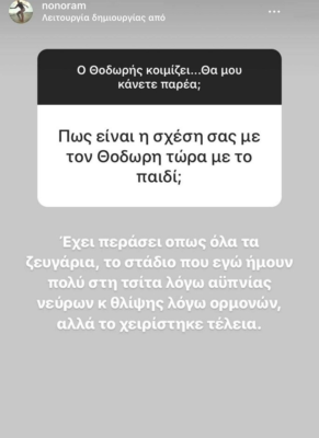 «Πώς είναι η σχέση σας με τον Θοδωρή τώρα με το παιδί;», ήταν μία από τις ερωτήσεις που της έκαναν οι διαδικτυακοί της φίλοι και η Ελεονώρα Μελέτη την απάντησε χωρίς δισταγμό.