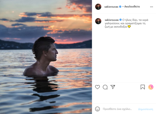 O Σάκης Ρουβάς που αυτό το διάστημα απολαμβάνει τις καλοκαιρινές τους διακοπές, δημοσίευσε στον προσωπικό του λογαριασμό στο Instagram μια φωτογραφία όπου φαίνεται να χαίρεται το μπάνιο του με φόντο το ηλιοβασίλεμα.