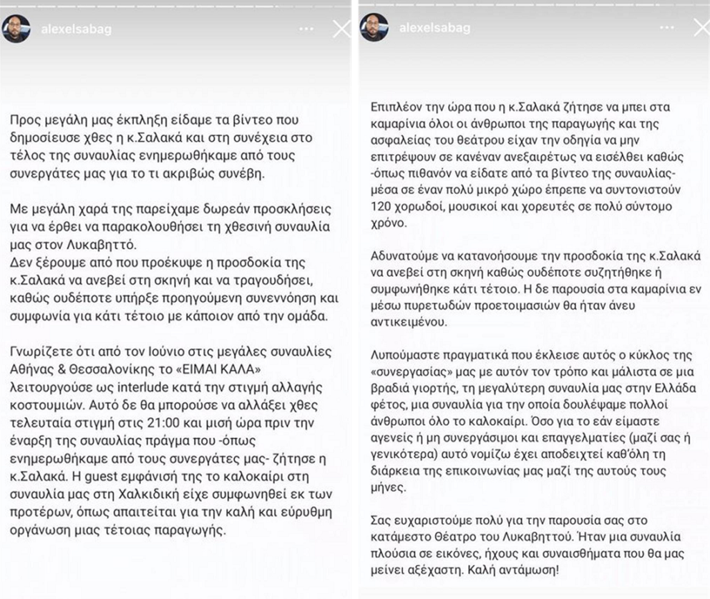 «Προς μεγάλη μας έκπληξη είδαμε τα βίντεο που δημοσίευσε χθες η κα. Σαλακά και στη συνέχεια, στο τέλος της συναυλίας, ενημερωθήκαμε από τους συνεργάτες μας για το τι ακριβώς συνέβη. Με μεγάλη χαρά της παρείχαμε δωρεάν προσκλήσεις για να έρθει να παρακολουθήσει τη χθεσινή μας συναυλία στον Λυκαβηττό. Δεν ξέρουμε από που προέκυψε η προσδοκία της κα. Σαλακά να ανέβει στη σκηνή και να τραγουδήσει, καθώς ουδέποτε υπήρξε προηγούμενη συνεννόηση και συμφωνία για κάτι τέτοιο με κάποιον από την ομάδα.