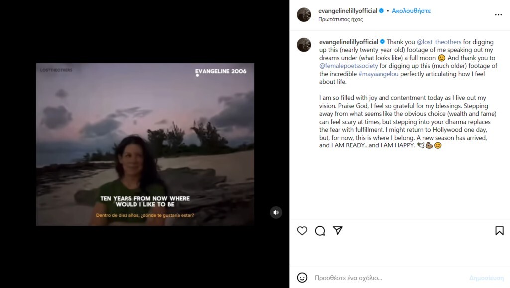 Μπορεί να επιστρέψω στο Χόλιγουντ μια μέρα, αλλά, προς το παρόν, ανήκω εδώ. Μια νέα σεζόν έφτασε, και είμαι έτοιμη και είμαι ευτυχισμένη», έγραψε η Lilly στην ανάρτηση του δημοσίευσε ένα βίντεο από το παρελθόν.