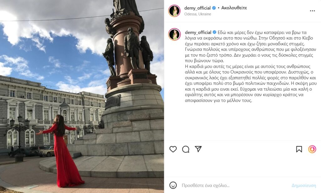 Η καρδιά μου αυτές τις μέρες είναι με αυτούς τους ανθρώπους αλλά και με όλους του Ουκρανούς που υποφέρουν. Δυστυχώς, ο ουκρανικός λαός έχει εξαπατηθεί πολλές φορές στο παρελθόν και έχει υποφέρει πολύ στο βωμό πολιτικών παιχνιδιών. Η σκέψη μου και η καρδιά μου είναι εκεί. Εύχομαι να τελειώσει μία και καλή ο εφιάλτης αυτός και να μπορέσουν σαν κυρίαρχο κράτος να αποφασίσουν για το μέλλον τους» έγραψε η Demy στην ανάρτησή της συνοδεύοντας την με μία φωτογραφία από την παραμονή της εκεί.