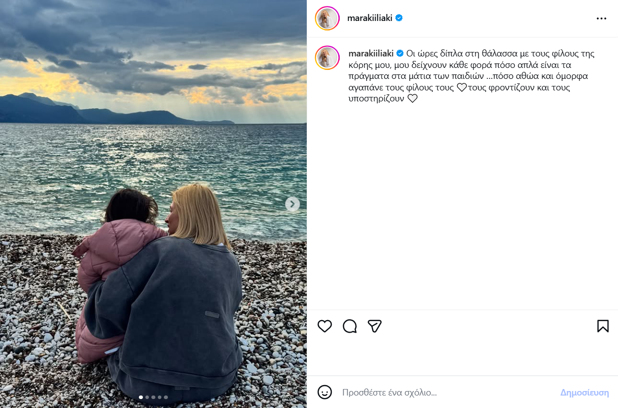 «Οι ώρες δίπλα στη θάλασσα με τους φίλους της κόρης μου, μου δείχνουν κάθε φορά πόσο απλά είναι τα πράγματα στα μάτια των παιδιών …πόσο αθώα και όμορφα αγαπάνε τους φίλους τους, τους φροντίζουν και τους υποστηρίζουν», έγραψε η Μαρία Ηλιάκη στη λεζάντα της ανάρτησης της θέλησε να μοιραστεί με τους followers της φωτογραφίες που τράβηξε με τις μικρές.
