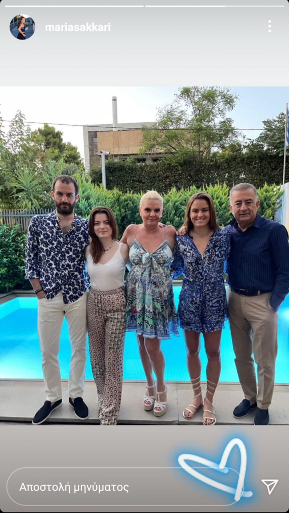 Στο στιγμιότυπο που μοιράστηκε με τους followers της στο instagram η Μαρία Σάκκαρη, την βλέπουμε με τους αγαπημένους γονείς της την μητέρα της και άλλοτε πρωταθλήτρια του τένις Αγγελική Κανελλοπούλου, τον πατέρα της Κώστα Σάκκαρη αλλά και τα άλλα δύο αδέλφια της.