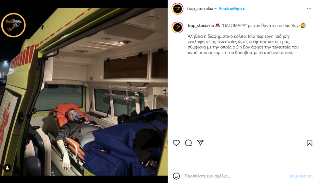 Μάλιστα, η ανάρτηση της σελίδας στο Instagram που δημοσίευσε την επίμαχη φωτογραφία αναφέρει πως κυκλοφορεί μια πληροφορία ότι ο Sin Βoy άφησε την τελευταία του πνοή σε νοσοκομείο του Κόσοβου έπειτα από υπερβολική δόση.