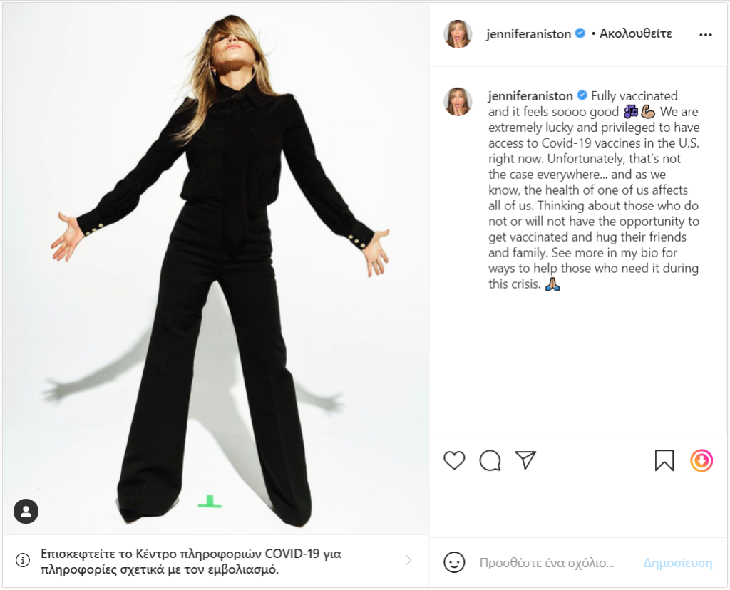Δείτε περισσότερα στο βιογραφικό μου για τρόπους βοήθειας, όσων το χρειάζονται κατά τη διάρκεια αυτής της κρίσης», έγραψε η Jennifer Aniston στην λεζάντα της ανάρτησής της.