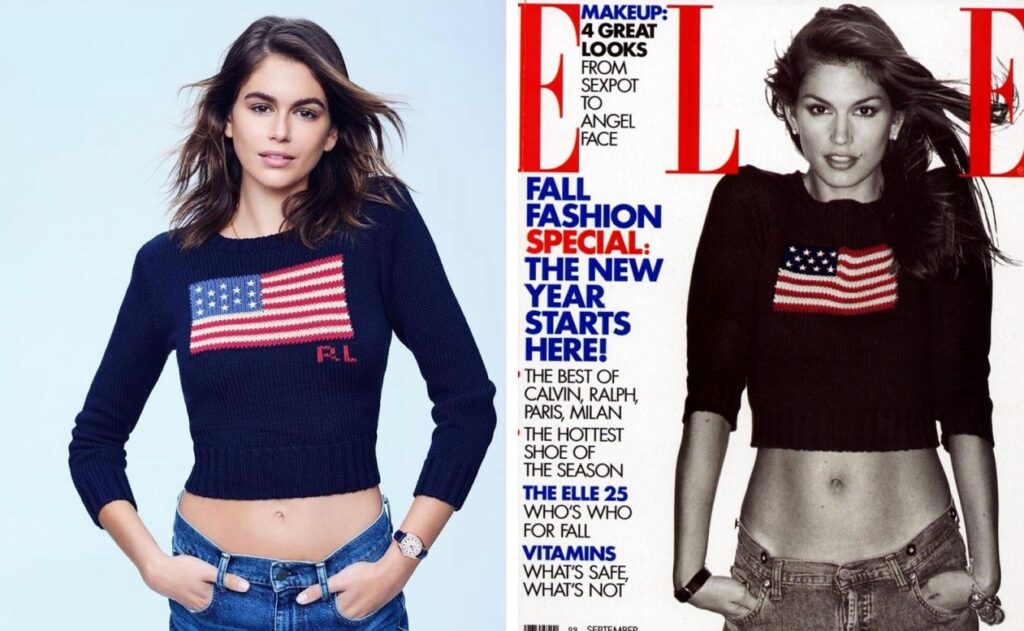 Συγκεκριμένα το super model ανέβασε μία φωτογραφία της κόρης της, στην οποία φορά ένα Ralph Lauren πουλόβερ, με την αμερικάνικη σημαία κεντημένη στο κέντρο του. Ενώ το πουλόβερ είναι ίδιο με το εκείνο που εμφανίστηκε και εκείνη το 1994.