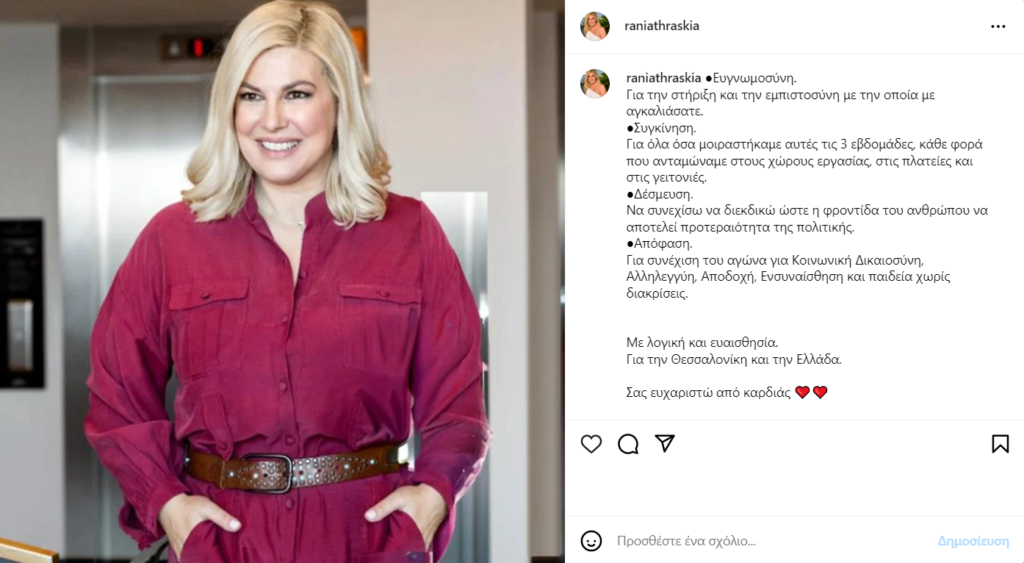 Μάλιστα, σε ανάρτηση της στον προσωπικό της λογαριασμό στο Instagram, η Ράνια Θρασκιά θέλησε να ευχαριστήσει όσους την στήριξαν.