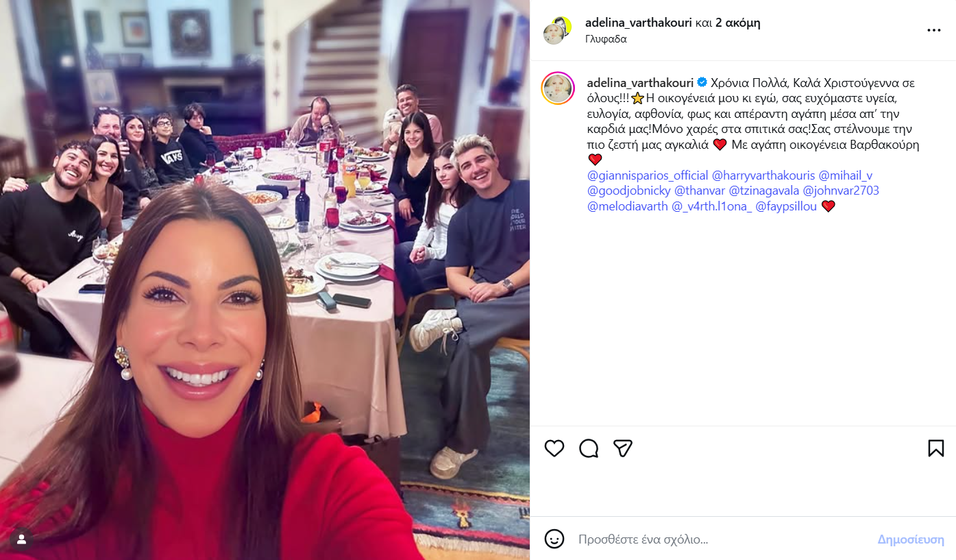 «Χρόνια Πολλά, Καλά Χριστούγεννα σε όλους!!! Η οικογένειά μου κι εγώ, σας ευχόμαστε υγεία, ευλογία, αφθονία, φως και απέραντη αγάπη μέσα απ’ την καρδιά μας! Μόνο χαρές στα σπιτικά σας! Σας στέλνουμε την πιο ζεστή μας αγκαλιά Με αγάπη οικογένεια Βαρθακούρη» έγραψε η Αντελίνα Βαρθακούρη στην ανάρτησή της.