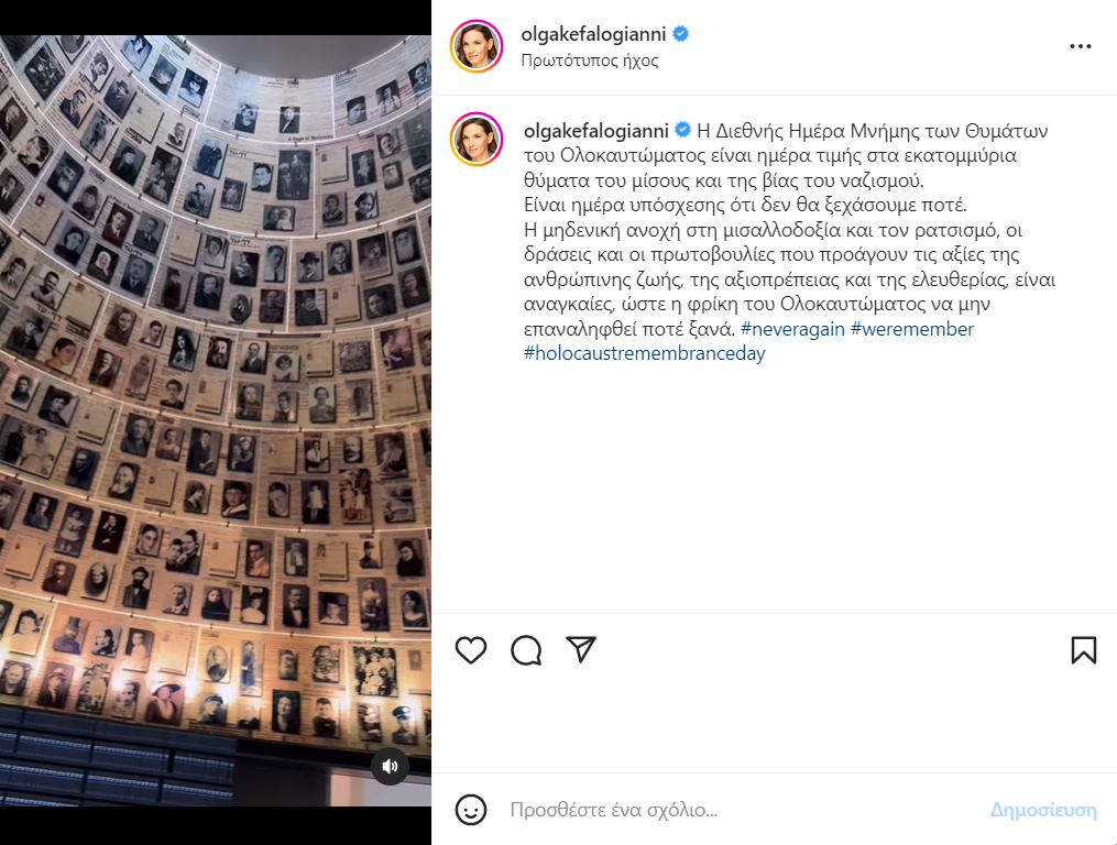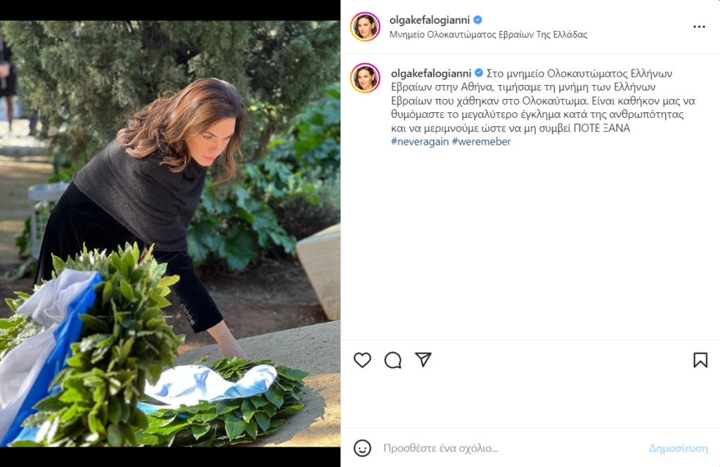 Διεθνής Ημέρα Μνήμης για τα Θύματα του Ολοκαυτώματος είναι η 27η Ιανουαρίου και η Όλγα Κεφαλογιάννη τίμησε την μνήμη των Ελλήνων Εβραίων που χάθηκαν στο Ολοκαύτωμα.
