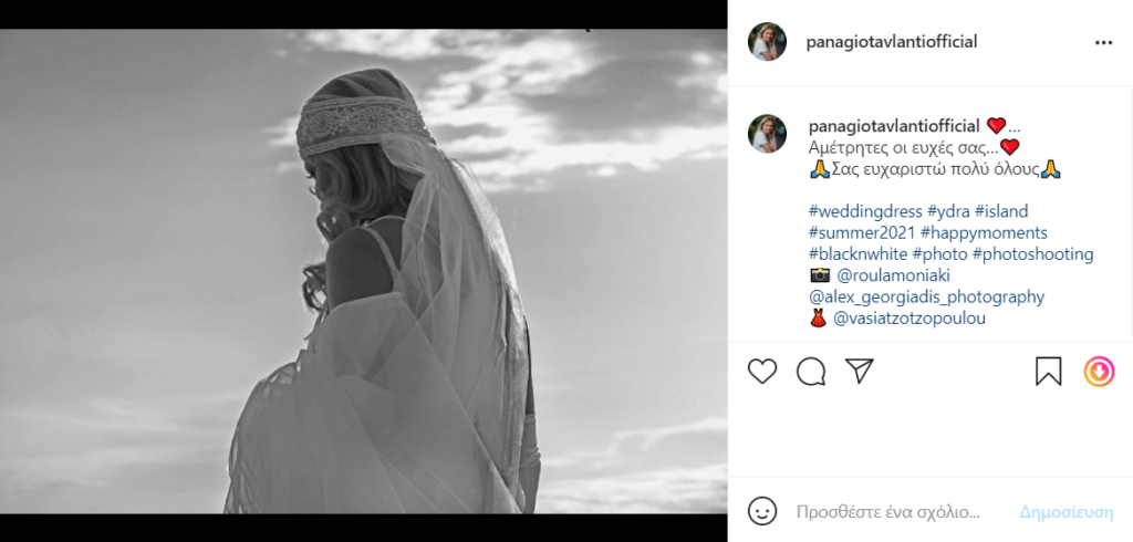 «…Αμέτρητες οι ευχές σας…Σας ευχαριστώ πολύ όλους. #weddingdress #ydra #island #summer2021 #happymoments #blacknwhite #photo #photoshooting», έγραψε η Παναγιώτα Βλαντή στην λεζάντα του post της.