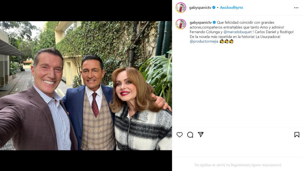 «Τι ευτυχία να βρίσκομαι με σπουδαίους ηθοποιούς, αγαπητούς συντρόφους που αγαπώ και θαυμάζω τόσο πολύ! Fernando Colunga και @marcelobuquet ! Carlos Daniel και Rodrigo! Από το πιο επαναλαμβανόμενο μυθιστόρημα της ιστορίας! Η σφετερίστρια! @productormejia» έγραψε η Spanic στη λεζάντα της φωτογραφίας της.