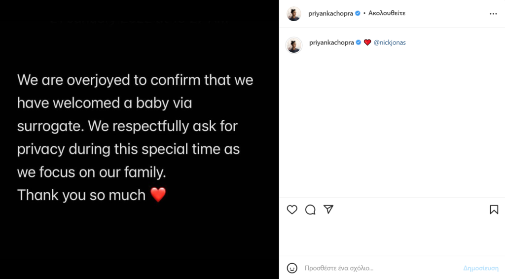 «Είμαστε ενθουσιασμένοι να σας ανακοινώσουμε ότι καλωσορίσαμε το μωρό μας, μέσω παρένθετης μητέρας. Με σεβασμό σας ζητάμε την ιδιωτικότητα μας σε αυτή την ιδιαίτερη περίοδο για εμάς που θέλουμε να επικεντρωθούμε στην οικογένειά μας» έγραψε η ανακοίνωση της Chopra.