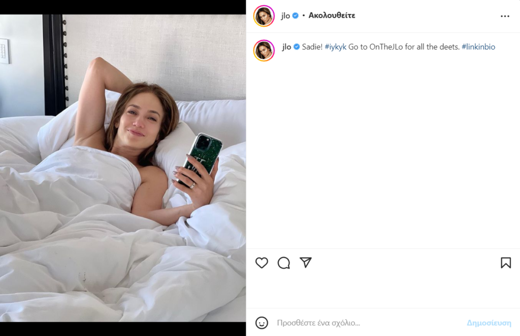 Συγκεκριμένα η JLO δεν δίστασε να μοιραστεί με τους 281 εκατομμύρια ακόλουθούς της, τη βέρα της, ποζάροντας τοπλες κάτω από τα σεντόνια και μη μπορώντας να κρύψει τη χαρά της.