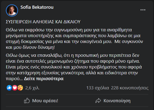 Με μια ανάρτηση μέσα από τον προσωπικό της στο λογαριασμό στο Facebook, η Σοφία Μπεκατώρου θέλησε να ευχαριστήσει δημόσια τον κόσμο για την στήριξη του, μετά την αποκάλυψη που έκανε ότι πριν από χρόνια δέχθηκε σεξουαλική κακοποίηση.