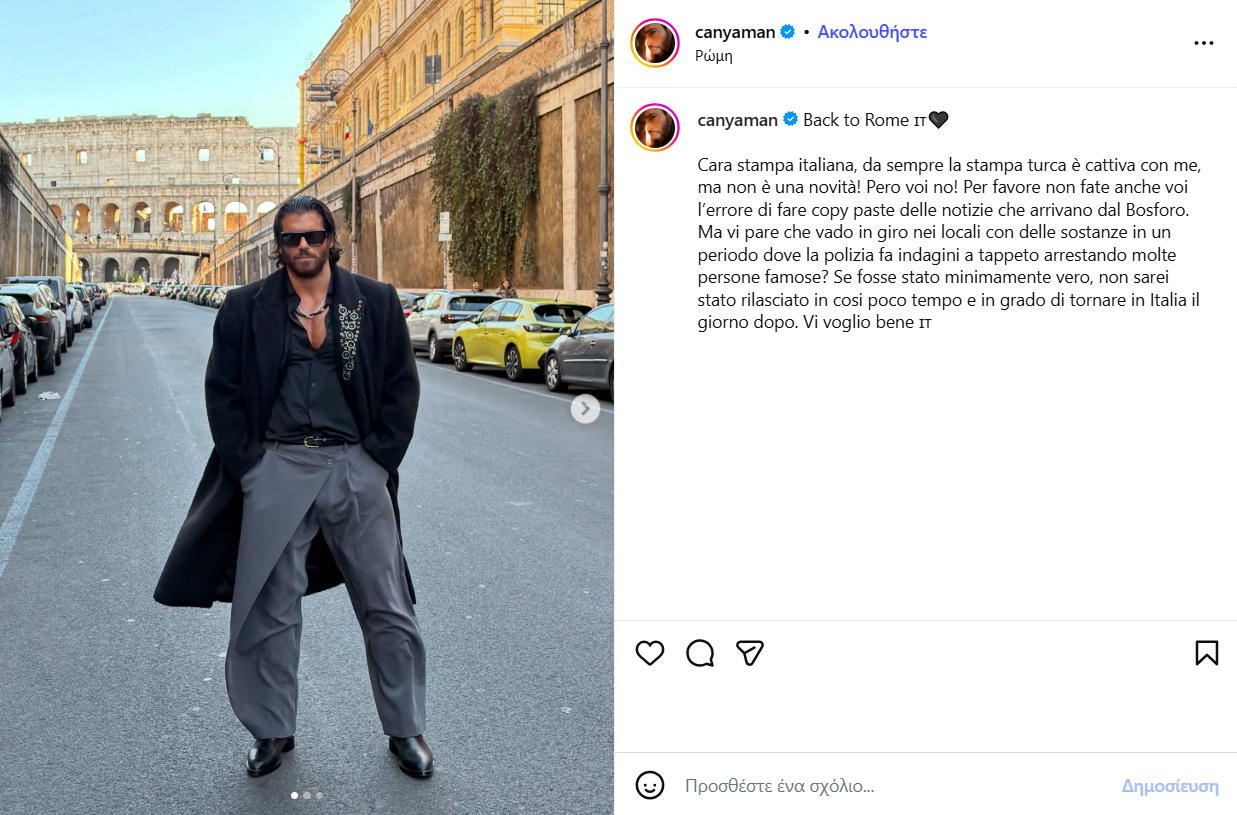 «Αγαπητά ιταλικά μέσα, είναι γνωστό ότι ο τουρκικός Τύπος με αντιμετωπίζει πάντα άσχημα. Αυτό δεν είναι κάτι καινούριο. Αλλά εσείς δεν είστε έτσι. Σας παρακαλώ, μην πέσετε στο λάθος του ρεπορτάζ που αντιγράφει. Σε μια περίοδο που η αστυνομία πιάνει πολλούς διάσημους και διεξάγει έρευνες μεγάλης κλίμακας, πιστεύετε πραγματικά ότι κυκλοφορώ σε νυχτερινά κέντρα με απαγορευμένες ουσίες; Αν υπήρχε έστω και η παραμικρή αλήθεια σε αυτό, δεν θα είχα αφεθεί τόσο γρήγορα ελεύθερος ούτε θα μπορούσα να επιστρέψω στην Ιταλία την επόμενη κιόλας μέρα. Σας αγαπώ όλους», έγραψε ο Can Yaman.