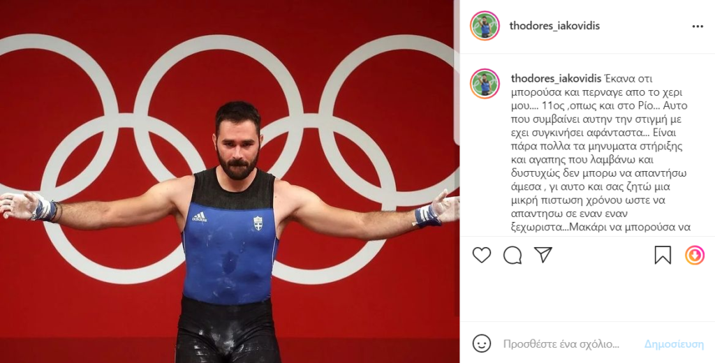 «Έκανα ό,τι μπορούσα και πέρναγε από το χέρι μου…. 11ος, όπως και στο Ρίο… Αυτό που συμβαίνει αυτήν την στιγμή με έχει συγκινήσει αφάνταστα… Είναι πάρα πολλά τα μηνύματα στήριξης και αγάπης που λαμβάνω και δυστυχώς δεν μπορώ να απαντήσω άμεσα, γι αυτό και σας ζητώ μια μικρή πίστωση χρόνου ώστε να απαντήσω σε έναν έναν ξεχωριστά…Μακάρι να μπορούσα να σας γνωρίσω έναν έναν προσωπικά, να σας κοιτάξω στα μάτια και να σας πω ένα μεγάλο ΕΥΧΑΡΙΣΤΩ… Δεν έχω λόγια…» έγραψε ο Θοδωρής Ιακωβίδης στην ανάρτηση του.
