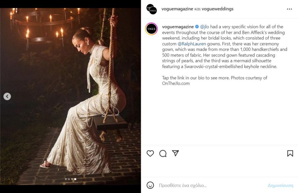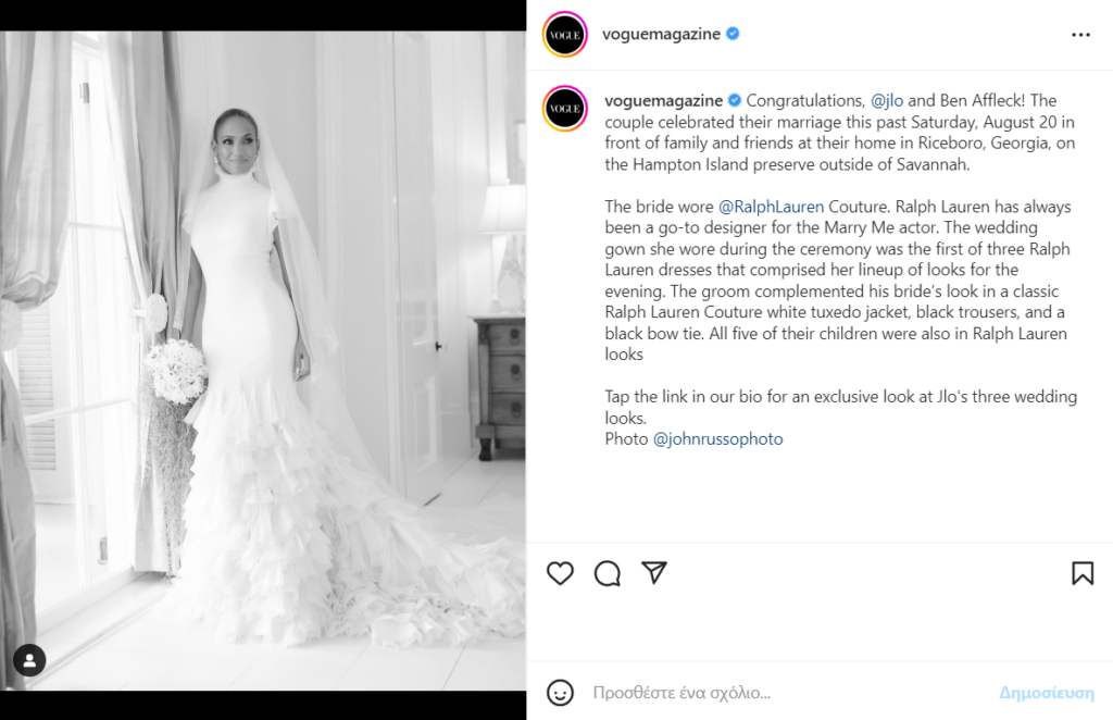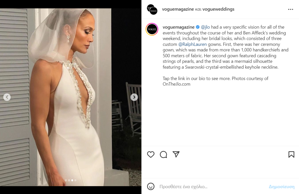 Μάλιστα, η Lopez για αυτή την σημαντική ημέρα εμπιστεύτηκε τον οίκο Ralph Lauren, που δημιούργησε για αυτήν 3 Couture custom bridal dresses.