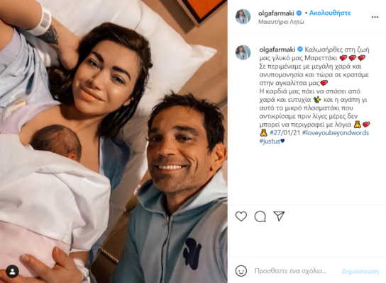 «Καλωσήρθες στη ζωή μας γλυκό μας Μαρεττάκι. Σε περιμέναμε με μεγάλη χαρά και ανυπομονησία και τώρα σε κρατάμε στην αγκαλίτσα μας. Η καρδιά μας πάει να σπάσει από χαρά και ευτυχία και η αγάπη γι αυτό το μικρό πλασματάκι που αντικρίσαμε πριν λίγες μέρες δεν μπορεί να περιγραφεί με λόγια. #27/01/21», έγραψε στη λεζάντα της ανάρτησής της η Όλγα Φαρμάκη.