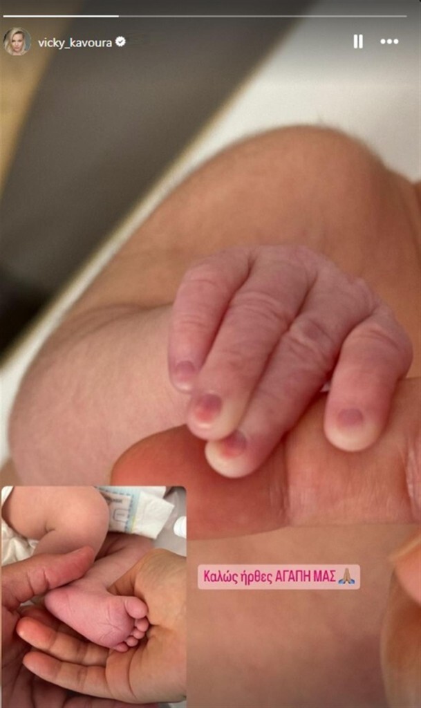 Ενώ λίγες ώρες μετά τη γέννηση της κόρης της η Βίκυ Κάβουρα ανέβασε στον προσωπικό της λογαριασμό στο Instagram την πρώτη φωτογραφία της και έγραψε: «Καλώς ήρθες αγάπη μας».