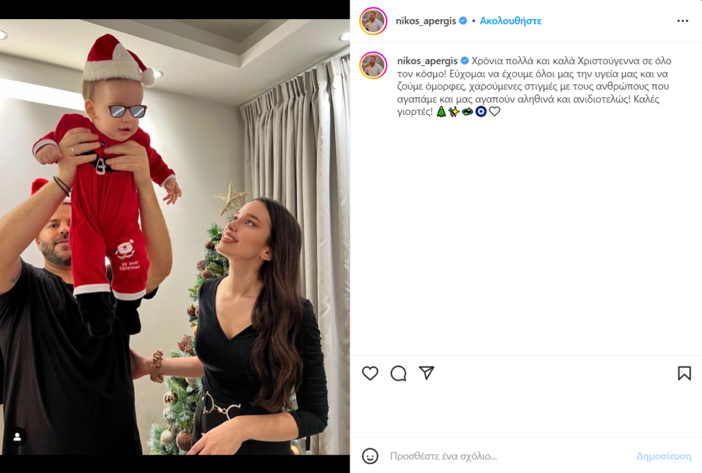 “Χρόνια πολλά και καλά Χριστούγεννα σε όλο τον κόσμο! Εύχομαι να έχουμε όλοι μας την υγεία μας και να ζούμε όμορφες, χαρούμενες στιγμές με τους ανθρώπους που αγαπάμε και μας αγαπούν αληθινά και ανιδιοτελώς! Καλές γιορτές”, έγραψε ο Νίκος Απέργης στην ανάρτηση του.