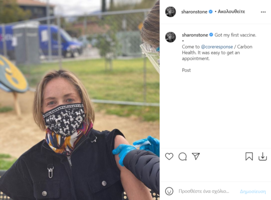 Στην εικόνα η Sharon Stone πόζαρε με μάσκα προστασίας και κάνοντας την πρώτη δόση του εμβολίου, παροτρύνει τον ακολούθους της να το κάνουν και εκείνοι