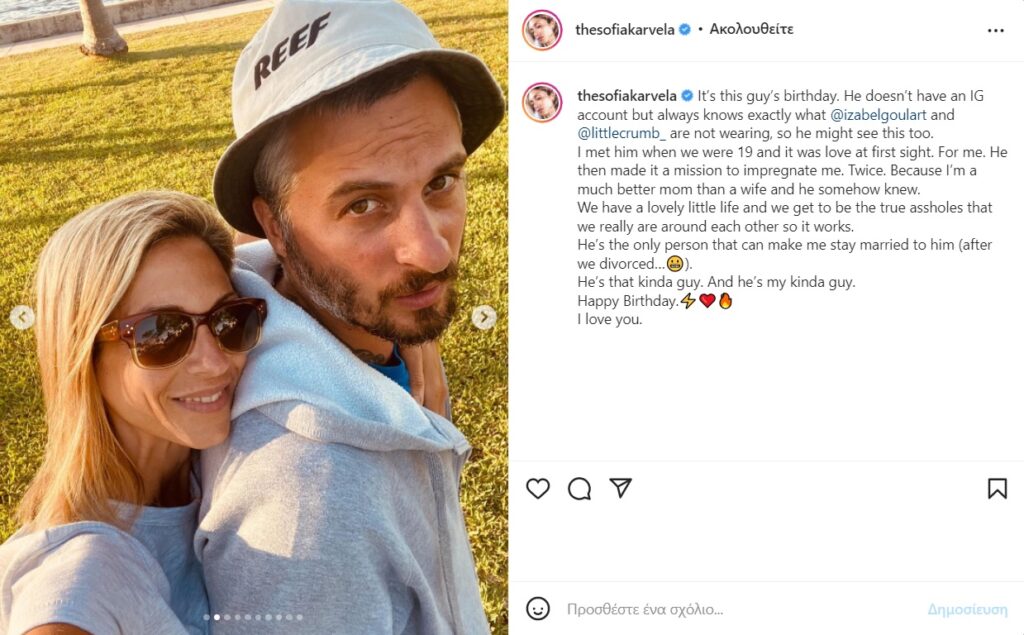 Έχουμε μια υπέροχη μικρή ζωή και γινόμαστε οι αληθινοί μ@λ@κες που πραγματικά είμαστε ο ένας γύρω από τον άλλον, οπότε λειτουργεί. Είναι το μόνο άτομο που μπορεί να με κάνει να μείνω παντρεμένη μαζί του (αφού χωρίσαμε…). Είναι ένας τέτοιος τύπος. Και είναι ο τύπος μου. Χρόνια Πολλά. Σε αγαπώ», έγραψε η Σοφία Καρβέλα στη λεζάντα της ανάρτησής της.