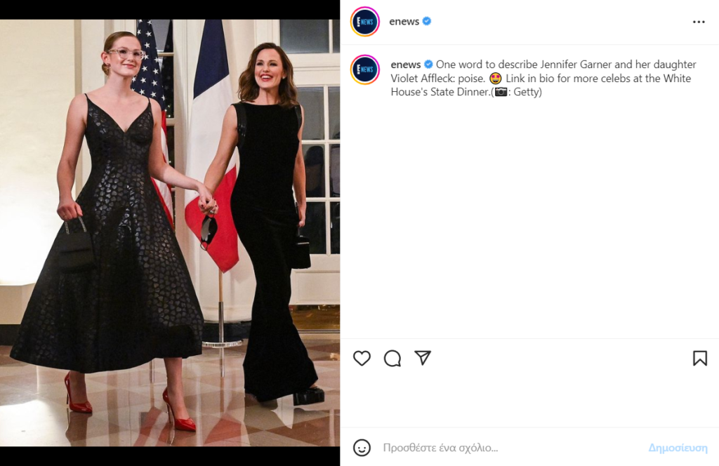 Η Garner που ήταν ανάμεσα στους 400 διάσημους καλεσμένους του Αμερικανού προέδρου για την πρώτη επίσημη επίσκεψη του Macron μετά την πανδημία, επέλεξε ένα μαύρο Ralph Lauren φόρεμα με πούλιες στα μανίκια. Ενώ το είχε συνδυάσει με Stuart Weitzman γόβες και ένα μαύρο τσαντάκι.