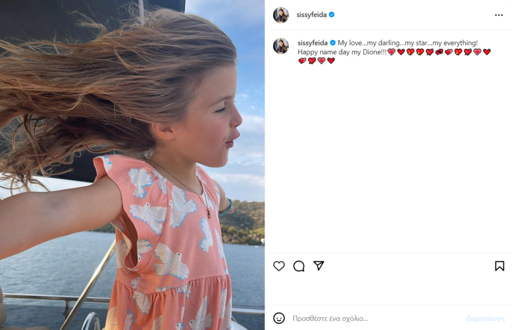 Συγκεκριμένα η Σίσσυ Φειδά δημοσίευσε ένα σπάνιο στιγμιότυπο της μικρής Διώνης, η οποία βρίσκεται πάνω σε σκάφος και απολαμβάνει την απέραντη θέα της θάλασσας.