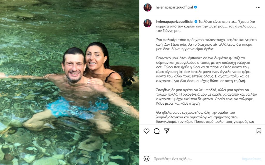 Μάλιστα, η Έλενα Παπαρίζου που είναι ιδιαίτερα ενεργή στα social media, δημοσίευσε στον λογαριασμό της στο Instagram μια κοινή φωτογραφία με τον Γιάννη Ράμο και τον αποχαιρέτησε με ένα σπαρακτικό μακροσκελές κείμενο.