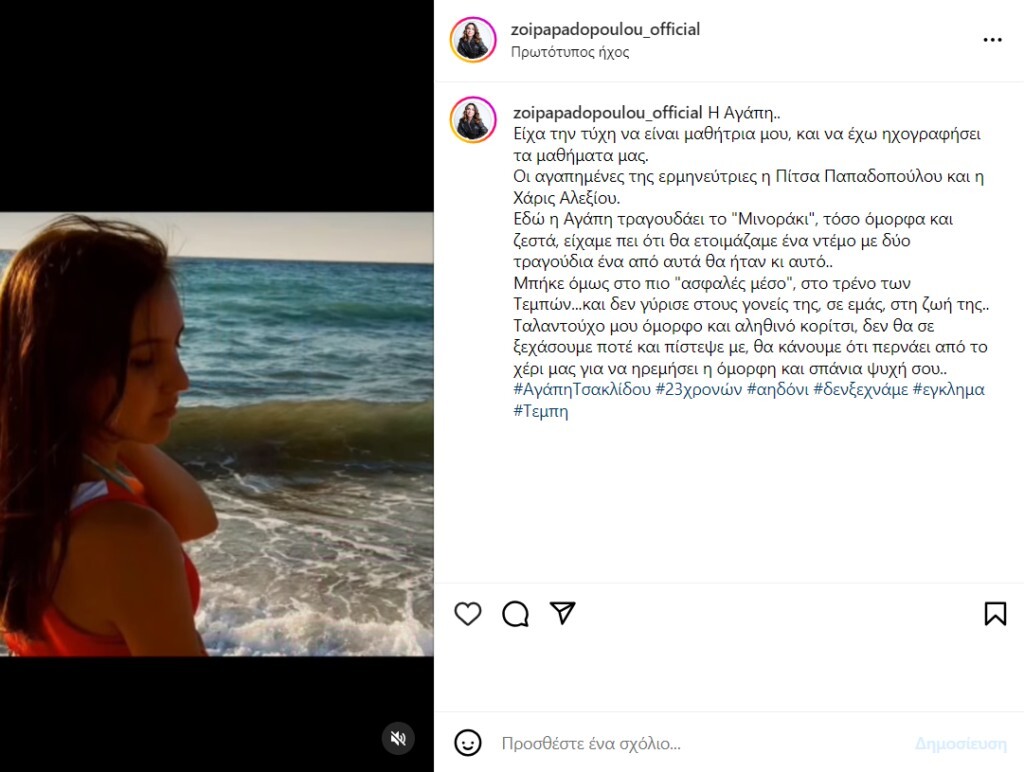Συγκεκριμένα η Ζωή Παπαδοπούλου δημοσίευσε στο Instagram ένα βίντεο από φωτογραφίες της Αγάπης Τσακλίδου που ήταν μαθήτρια της και ήταν ανάμεσα στα θύματα, το οποίο συνόδευσε με ένα σπαρακτικό μήνυμα.