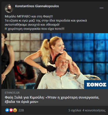 Με μία φωτογραφία στον προσωπικό του λογαριασμό στο Facebook, ο ηθοποιός έγραψε: «Μεγάλο ΜΠΡΑΒΟ και στη Φαίη!!! Τα έζησα κι εγώ μαζί της στην ίδια περιοδεία και φυσικά αντισταθήκαμε ανοιχτά και σθεναρά! Η χειρότερη συνεργασία που είχα ποτέ!!!».