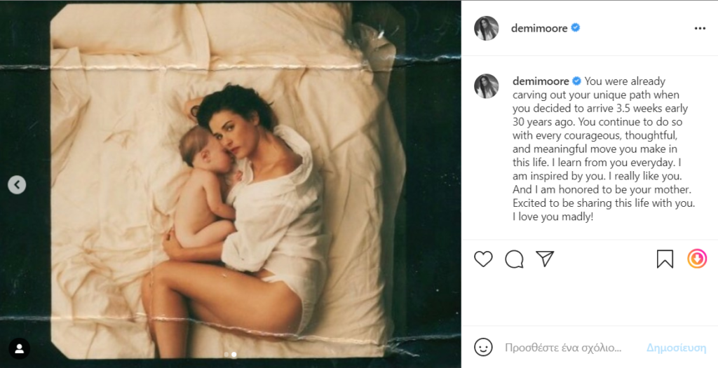 Συγκεκριμένα η Demi Moore που είναι ιδιαίτερα ενεργή στα social media, ευχήθηκε στην κόρη της δημοσιεύοντας γλυκά στιγμιότυπα, συμπεριλαμβανομένης μιας throwback φωτογραφίας από το 1991, όταν η Scout ήταν μωρό στην αγκαλιά της μητέρας της.