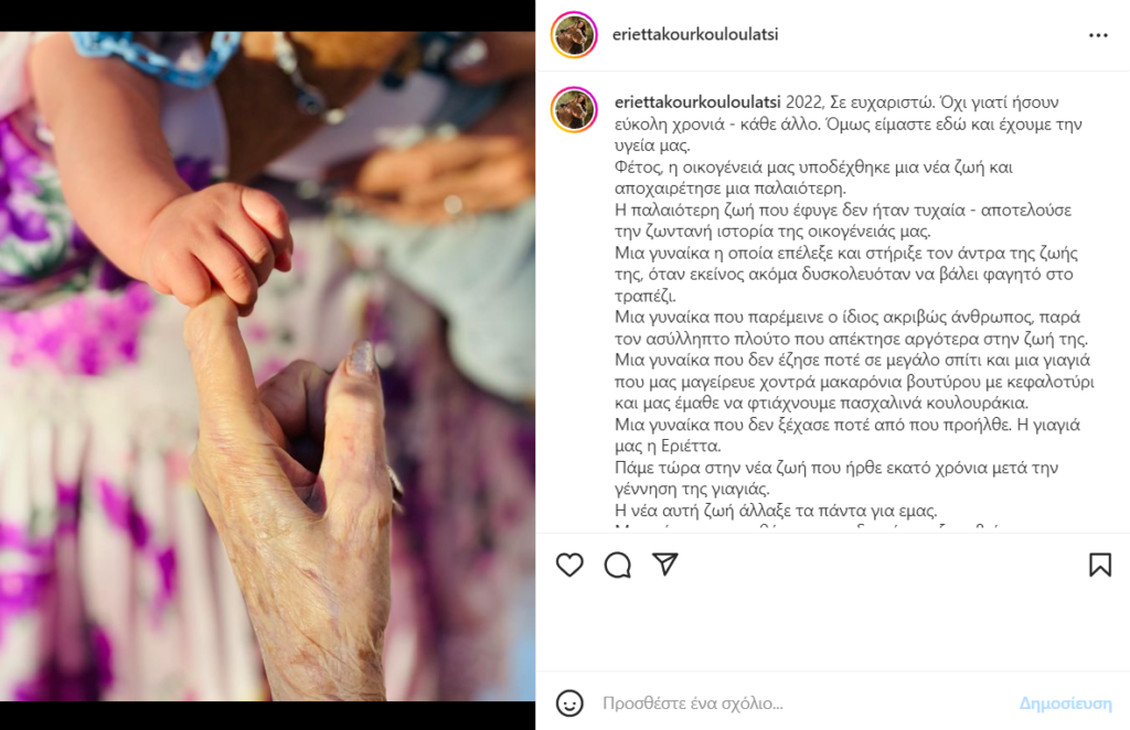Μια συγκινητική ανάρτηση στον προσωπικό της λογαριασμό στο Instagram, έκανε η Εριέττα Κούρκουλου λίγες ημέρες μετά το θάνατο της γιαγιάς της, Εριέττας Λάτση.