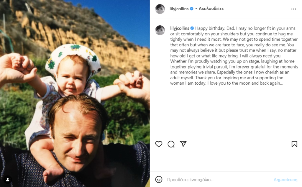 Συγκεκριμένα η Lily ανέβασε στον προσωπικό της λογαριασμό στο Instagram μια φωτογραφία από το παρελθόν όπου είναι πάνω στους ωμούς του πατέρα της και στην λεζάντα του post της έγραψε:
