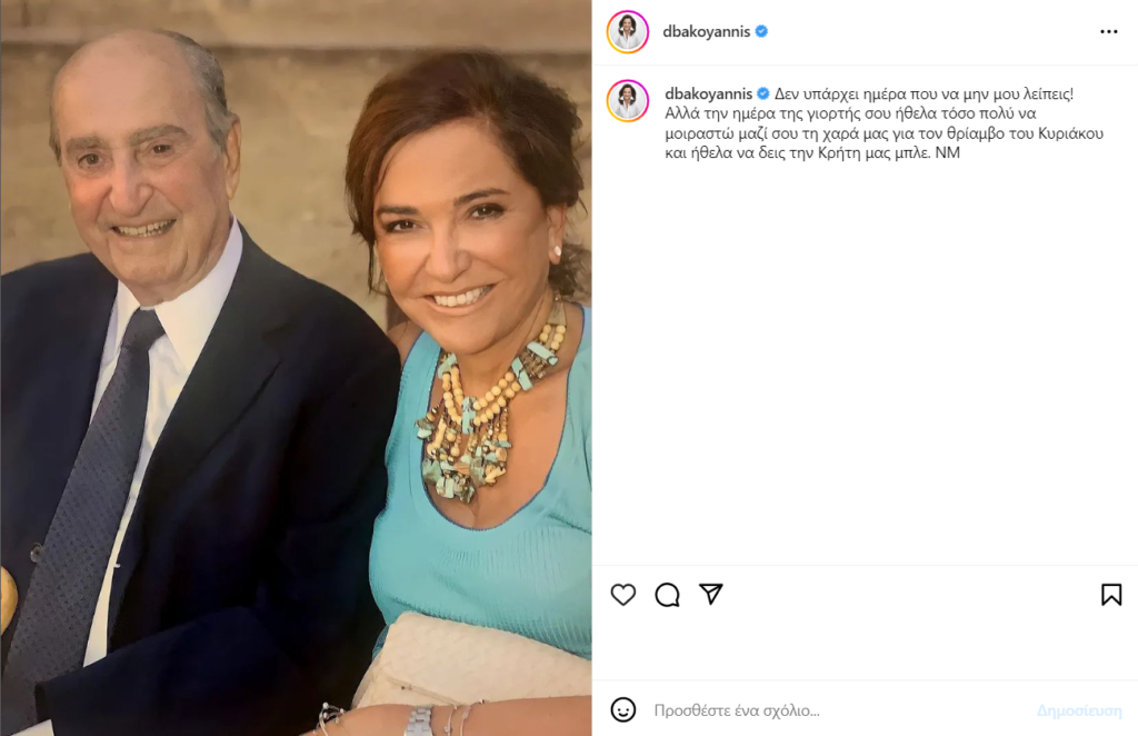 «Δεν υπάρχει ημέρα που να μην μου λείπεις! Αλλά την ημέρα της γιορτής σου ήθελα τόσο πολύ να μοιραστώ μαζί σου τη χαρά μας για τον θρίαμβο του Κυριάκου και ήθελα να δεις την Κρήτη μας μπλε. ΝΜ», έγραψε η Ντόρα Μπακογιάννη.