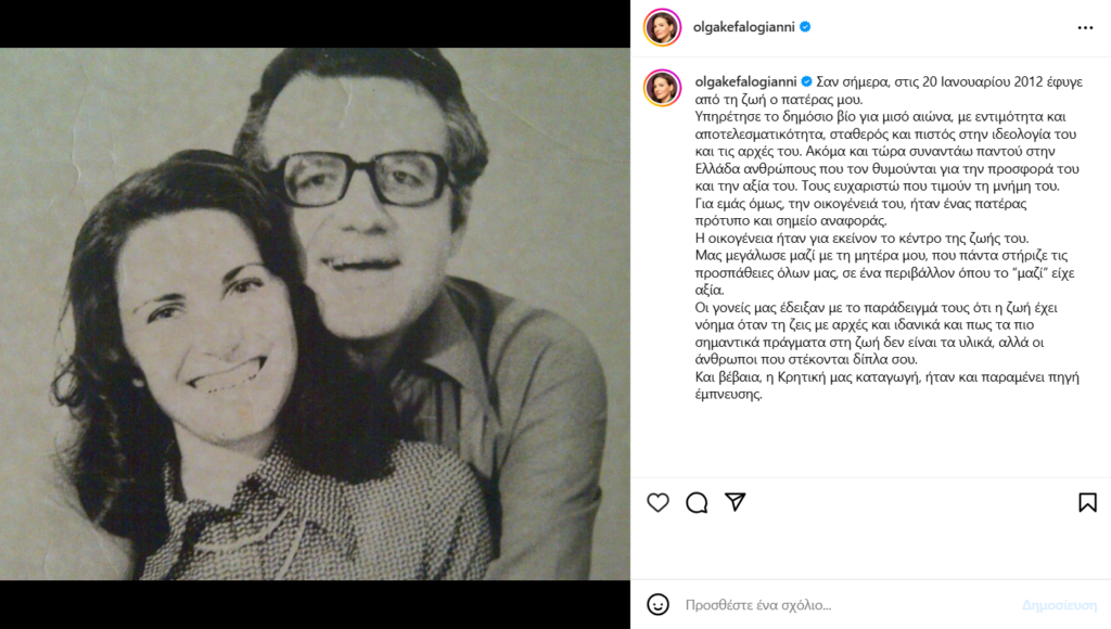 Μας μεγάλωσε μαζί με τη μητέρα μου, που πάντα στήριζε τις προσπάθειες όλων μας, σε ένα περιβάλλον όπου το “μαζί” είχε αξία. Οι γονείς μας έδειξαν με το παράδειγμά τους ότι η ζωή έχει νόημα όταν τη ζεις με αρχές και ιδανικά και πως τα πιο σημαντικά πράγματα στη ζωή δεν είναι τα υλικά, αλλά οι άνθρωποι που στέκονται δίπλα σου. Και βέβαια, η Κρητική μας καταγωγή, ήταν και παραμένει πηγή έμπνευσης», έγραψε στην ανάρτησή της η Όλγα Κεφαλογιάννη και συγκίνησε με τα λόγια της αλλά και την throwback φωτογραφία που ανέβασε.