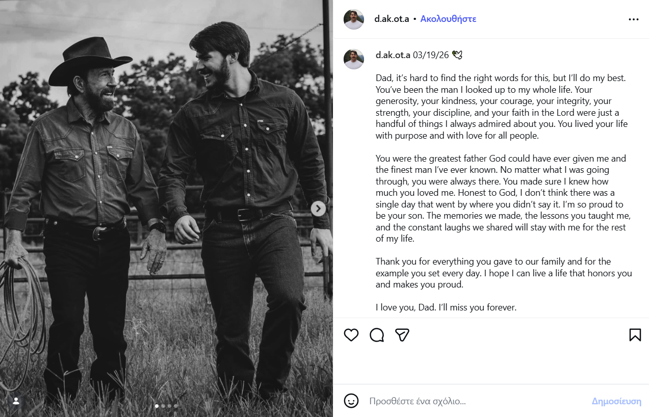 Φρόντιζες να ξέρω πόσο πολύ με αγαπάς. Ειλικρινά, δεν νομίζω ότι υπήρξε ούτε μία μέρα που να πέρασε χωρίς να μου το πεις. Είμαι τόσο περήφανος που είμαι γιος σου. Οι αναμνήσεις που δημιουργήσαμε, τα μαθήματα που μου έδωσες και τα αμέτρητα γέλια που μοιραστήκαμε θα μείνουν μαζί μου για όλη μου τη ζωή. Σε ευχαριστώ για όλα όσα πρόσφερες στην οικογένειά μας και για το παράδειγμα που έδινες κάθε μέρα. Ελπίζω να μπορέσω να ζήσω μια ζωή που θα σε τιμά και θα σε κάνει περήφανο. Σ’ αγαπώ, μπαμπά. Θα μου λείπεις για πάντα», έγραψε ο Dakota Norris και “αποχαιρέτησε” τον πατέρα του.