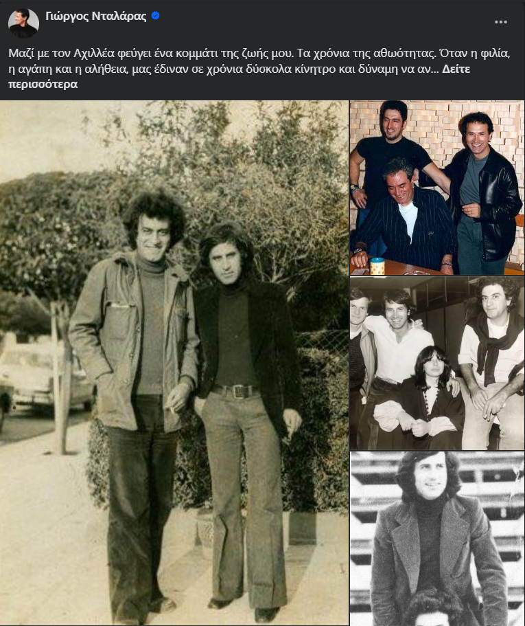 «Μαζί με τον Αχιλλέα φεύγει ένα κομμάτι της ζωής μου. Τα χρόνια της αθωότητας. Όταν η φιλία, η αγάπη και η αλήθεια, μας έδιναν σε χρόνια δύσκολα κίνητρο και δύναμη να αντέξουμε να παλέψουμε και να δημιουργήσουμε. Φιλίες που έκαναν τη ζωή μας ωραία. Σ’ ευχαριστώ, Αχιλλέα μου! Σ’ ευχαριστώ για όλα!», έγραψε ο Γιώργος Νταλάρας.