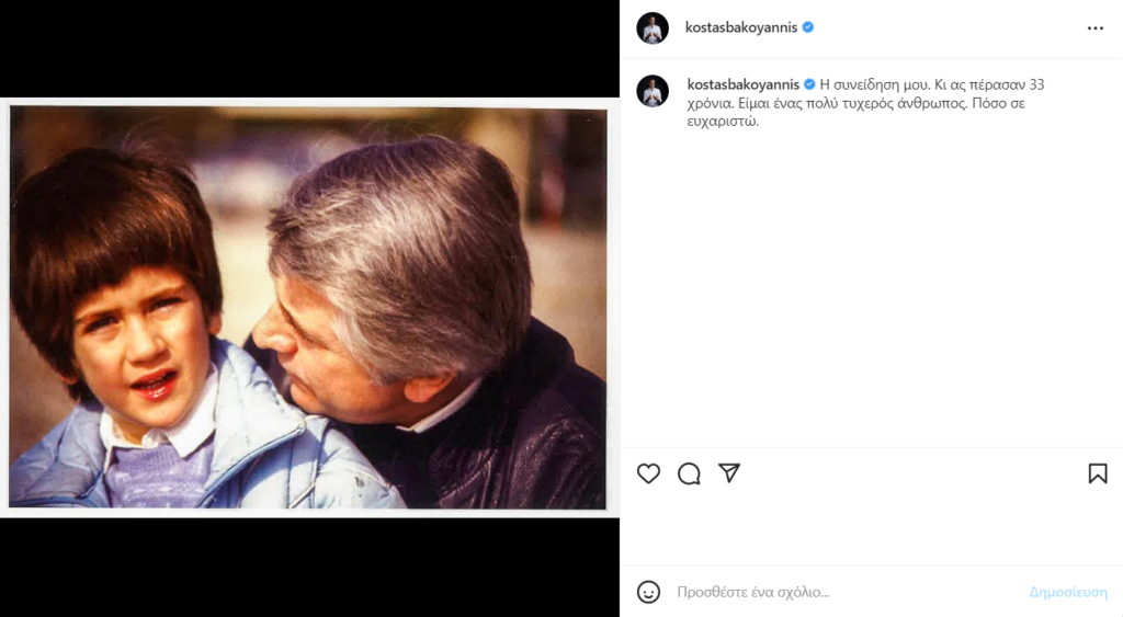 Συγκεκριμένα ο Κώστας Μπακογιάννης ανήρτησε μια φωτογραφία από την παιδική του ηλικία, στην οποία ποζάρει στο πλευρό του πατέρα του και έγραψε στη λεζάντα: